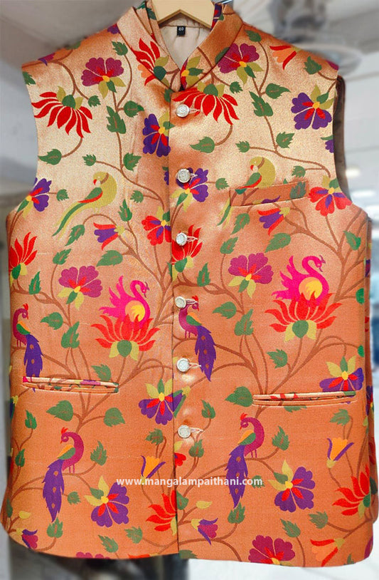Paithani Silk Jacket For Men - Peach with Multicolor Floral & Peacock Design