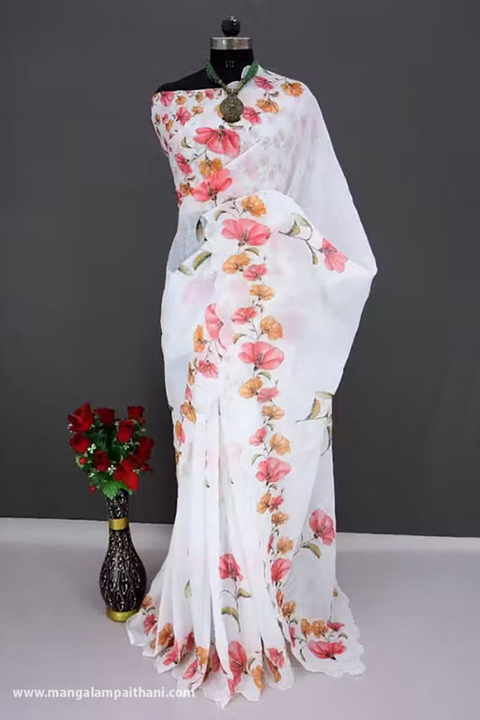 Elegant White Floral Print Georgette Saree (Pack Of 2)